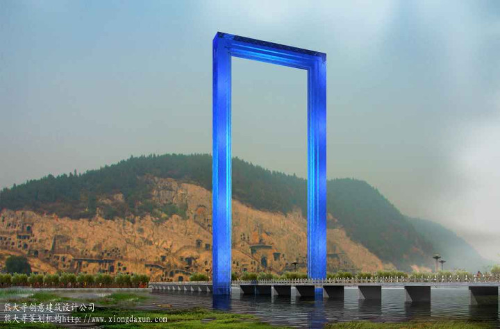 描述:在漫水桥前后,即河道正中创意建设“龙门”,用钢架和水晶构成,造型极简,两竖一横,用LED灯装饰整个建筑,晚上打灯,远远望去,整个建筑光彩夺目,犹如一尊释放圣光的天门,同时象征龙门、佛门、石窟门、天门、法门、心门,与2345个石窟门形成呼应,在景区的尽头形成高潮和总结,也具有鱼跃龙门的美好含义,成为一个世界级的艺术奇观和震撼心灵的景区地标。